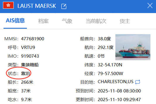 一艘4258标准箱的集装箱船“Laust Maersk”号在从查尔斯顿前往哥伦比亚卡塔赫纳的航程中,货舱发生火灾,目前正锚泊在查尔斯顿港外。